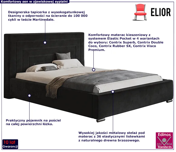 Duva 4X marki Edinos Premium powstało z myślą o użytkownikach, którzy poszukują solidnego łóżka o wysokich parametrach jakościowych, wieloletniej trwałości, z profesjonalnym materacem oraz doskonałą prezencją. Podstawę mebla tworzy skrzynia o grubości 1,6 mm, wykonana z drewna naturalnego i płyty meblowej zbudowanej z włókien drzewnych i związków organicznych. Na skrzyni obłożonej profesjonalną pianką o grubości T25 i tapicerowanej szlachetną tkaniną welwetową opiera się metalowy stelaż z 36 sprężynującymi listewkami z naturalnego drewna brzozowego. Układ drewnianych listew ułatwia cyrkulację powietrza pod materacem, co dobrze wpływa na jakość snu oraz wydłuża żywotność materaca. Na całej długości łóżka jest praktyczny pojemnik na pościel, łatwo otwierany przy pomocy specjalistycznych podnośników sprężynowych. Atutem modelu Duva 4X jest wysoki zagłówek wykonany w najnowszej technologii przez zautomatyzowanego robota, dzięki czemu wzór jest wyjątkowo precyzyjny i znakomicie się prezentuje. W tak wykonanym łóżku Duva 4X marki Edinos Premium będziesz sypiać zdrowo, budzić się piękniejsza. A Twoja sypialnia będzie marzeniem przyjaciółek.