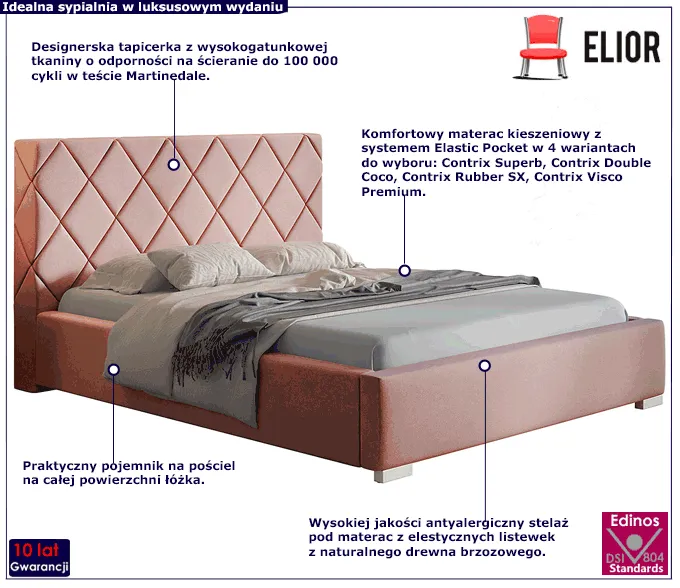 Tapicerowane łóżko Kera 3X marki Edinos Premium powstało w odpowiedzi na potrzeby naszych klientów, którzy poszukują wygodnego, trwałego i stylowego łóżka do sypialni. Łóżko Kera 3X zostało wykonane z wysokogatunkowych materiałów o wyższej niż przeciętna trwałości. Podstawę mebla tworzy skrzynia o grubości 1,6 mm, wykonana z drewna naturalnego i płyty meblowej zbudowanej z włókien drzewnych i związków organicznych. Na skrzyni obłożonej profesjonalną pianką o grubości T25 i tapicerowanej szlachetną tkaniną welwetową opiera się antyalergiczny stelaż z 32 sprężynujących listewek z naturalnego drewna brzozowego. Układ drewnianych listew ułatwia cyrkulację powietrza pod materacem, co dobrze wpływa na jakość snu oraz wydłuża żywotność materaca. Na całej długości łóżka znajduje się praktyczny schowek na pościel, bardzo łatwo otwierany przy pomocy specjalistycznych podnośników sprężynowych. Niezaprzeczalnym atutem łóżka Kera 3X jest wysoki pikowany zagłówek wykonany w najnowszej technologii przez zautomatyzowanego robota, dzięki czemu wzór jest wyjątkowo precyzyjny i znakomicie się prezentuje. Ponadczasowy design wraz z bogatą kolorystyką tapicerki do wyboru nadaje meblowi zjawiskowej aury i wspaniale stylizuje wnętrze sypialni.
