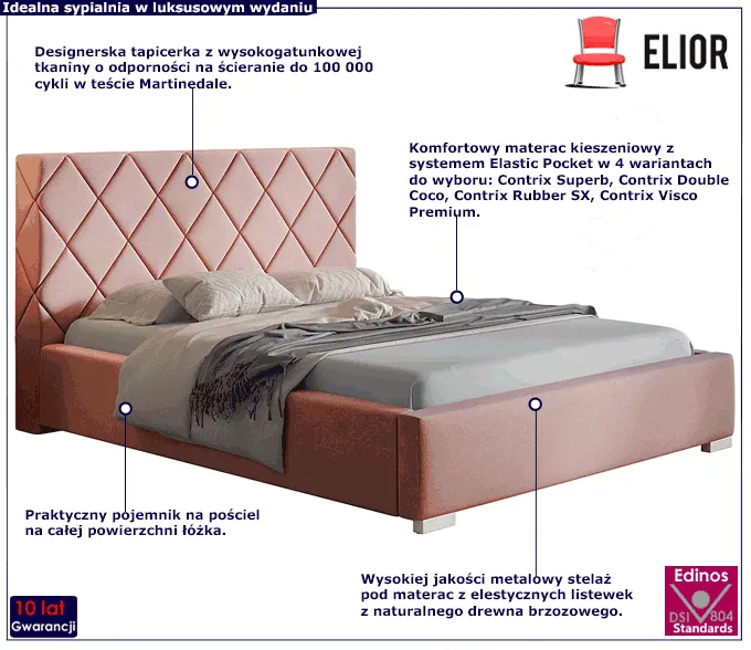 Tapicerowane łóżko Kera 4X marki Edinos Premium powstało w odpowiedzi na potrzeby naszych klientów, którzy poszukują wygodnego, trwałego i stylowego łóżka do sypialni. Łóżko Savana 3X zostało wykonane z wysokogatunkowych materiałów o wyższej niż przeciętna trwałości. Podstawę mebla tworzy skrzynia o grubości 1,6 mm, wykonana z drewna naturalnego i płyty meblowej zbudowanej z włókien drzewnych i związków organicznych. Na skrzyni obłożonej profesjonalną pianką o grubości T25 i tapicerowanej szlachetną tkaniną welwetową opiera się metalowy stelaż ze sprężynującymi listewkami z naturalnego drewna brzozowego. Układ drewnianych listew ułatwia cyrkulację powietrza pod materacem, co dobrze wpływa na jakość snu oraz wydłuża żywotność materaca. Na całej długości łóżka znajduje się praktyczny schowek na pościel, bardzo łatwo otwierany przy pomocy specjalistycznych podnośników gazowych. Niezaprzeczalnym atutem łóżka Kera 4X jest wysoki pikowany zagłówek wykonany w najnowszej technologii przez zautomatyzowanego robota, dzięki czemu wzór jest wyjątkowo precyzyjny i znakomicie się prezentuje. Ponadczasowy design wraz z bogatą kolorystyką tapicerki do wyboru nadaje meblowi zjawiskowej aury i wspaniale stylizuje wnętrze sypialni.