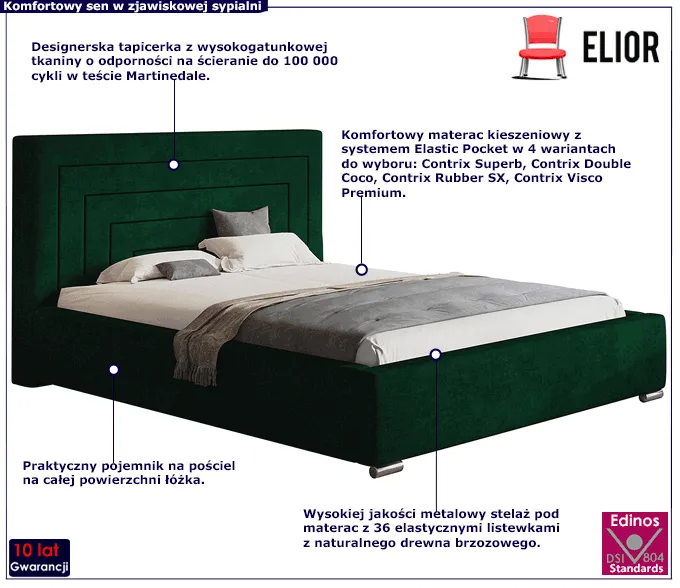 Duva 4X marki Edinos Premium powstało z myślą o użytkownikach, którzy poszukują solidnego łóżka o wysokich parametrach jakościowych, wieloletniej trwałości, z profesjonalnym materacem oraz doskonałą prezencją. Podstawę mebla tworzy skrzynia o grubości 1,6 mm, wykonana z drewna naturalnego i płyty meblowej zbudowanej z włókien drzewnych i związków organicznych. Na skrzyni obłożonej profesjonalną pianką o grubości T25 i tapicerowanej szlachetną tkaniną welwetową opiera się metalowy stelaż z 36 sprężynującymi listewkami z naturalnego drewna brzozowego. Układ drewnianych listew ułatwia cyrkulację powietrza pod materacem, co dobrze wpływa na jakość snu oraz wydłuża żywotność materaca. Na całej długości łóżka jest praktyczny pojemnik na pościel, łatwo otwierany przy pomocy specjalistycznych podnośników sprężynowych. Atutem modelu Duva 4X jest wysoki zagłówek wykonany w najnowszej technologii przez zautomatyzowanego robota, dzięki czemu wzór jest wyjątkowo precyzyjny i znakomicie się prezentuje. W tak wykonanym łóżku Duva 4X marki Edinos Premium będziesz sypiać zdrowo, budzić się piękniejsza. A Twoja sypialnia będzie marzeniem przyjaciółek.