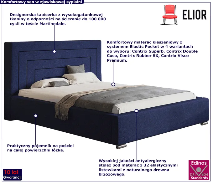 Duva 3X marki Elior powstało z myślą o użytkownikach, którzy poszukują solidnego łóżka o wysokich parametrach jakościowych, wieloletniej trwałości, z profesjonalnym materacem oraz doskonałą prezencją. Podstawę mebla tworzy skrzynia o grubości 1,6 mm, wykonana z drewna naturalnego i płyty meblowej zbudowanej z włókien drzewnych i związków organicznych. Na skrzyni obłożonej profesjonalną pianką o grubości T25 i tapicerowanej szlachetną tkaniną welwetową opiera się antyalergiczny stelaż z 32 sprężynujących listewek z naturalnego drewna brzozowego. Układ drewnianych listew ułatwia cyrkulację powietrza pod materacem, co dobrze wpływa na jakość snu oraz wydłuża żywotność materaca. Na całej długości łóżka jest praktyczny pojemnik na pościel, łatwo otwierany przy pomocy specjalistycznych podnośników sprężynowych. Atutem modelu Duva 3X jest wysoki zagłówek wykonany w najnowszej technologii przez zautomatyzowanego robota, dzięki czemu wzór jest wyjątkowo precyzyjny i znakomicie się prezentuje. W tak wykonanym łóżku Duva 3X marki Elior będziesz sypiać zdrowo, budzić się piękniejsza. A Twoja sypialnia będzie marzeniem przyjaciółek.