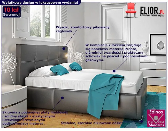 - Łóżko wyposażone jest w duży pojemnik na pościel z podnośnikami gazowymi, które ułatwiają podnoszenie, stelaż z elastycznymi listewkami drewnianymi, wysokiej jakości materac Pronto o średniej twardości.