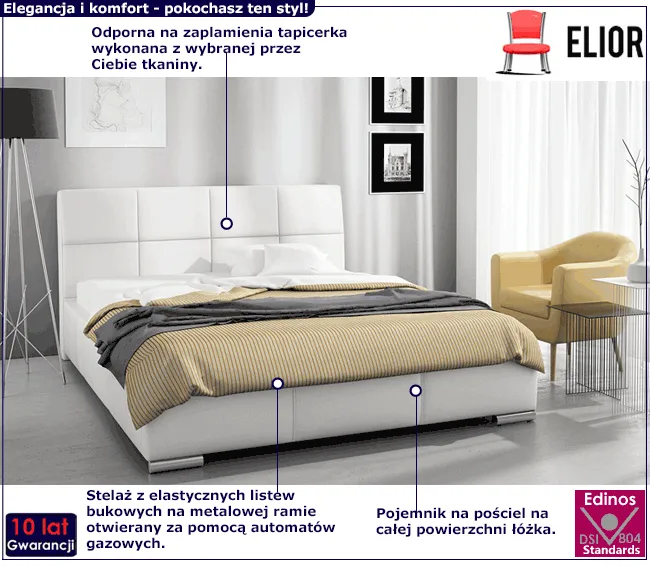 Zdrowy sen to warunek dobrego nastroju i świetnego samopoczucia. Podczas snu regeneruje się ciało i umysł, dlatego jego jakość jest kluczowym elementem szczęśliwego życia. Niestety czasem cierpimy na zaburzenia snu. Często przyczyna bezsenności tkwi w źle dobranym, niewygodnym łóżku. Tapicerowane łóżko Privex 3X marki Edinos Premium to model zaprojektowany specjalnie dla osób szukających szczególnej jakości i komfortu. Jego atutem jest wysoki zagłówek, który nadaje modernistyczny ton w sypialni, a jednocześnie jest przytulnym i komfortowym oparciem dla pleców podczas czytania książki, czy oglądania ulubionego serialu. Dodatkowo skutecznie chroni ścianę przed zabrudzeniem. Konstrukcję łóżka Privex 3X stanowi solidna rama z podwójnej płyty meblowej, metalowy stelaż z elastycznymi listewkami drewnianymi i duży pojemnik na pościel z podnośnikami gazowymi. Zadbaj o siebie i sprawdź jak dobrze się wyśpisz w mistrzowskim łóżku Privex 3X!