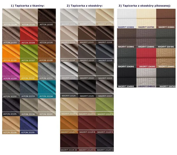 Twoje łóżko Paleo możesz zamówić w innej wersji kolorystycznej - aż 44 kolory tapicerki do wyboru (łóżko możemy pokryć tkaniną Aston V3+ lub ekoskórą Madryt 7TX). Uwaga! Pikowania są dostępne w 4 wersjach katalogowych i w wersji z tapicerką z ekoskóry pikowanej. Jeśli wybierzesz tapicerkę z ekoskóry gładkiej lub z tkaniny Aston V3 Twoje łóżko nie będzie posiadało pikowania. Zdjęcia łóżka zamieszczone na stronie mają charakter wyłącznie poglądowy.
