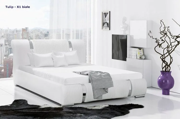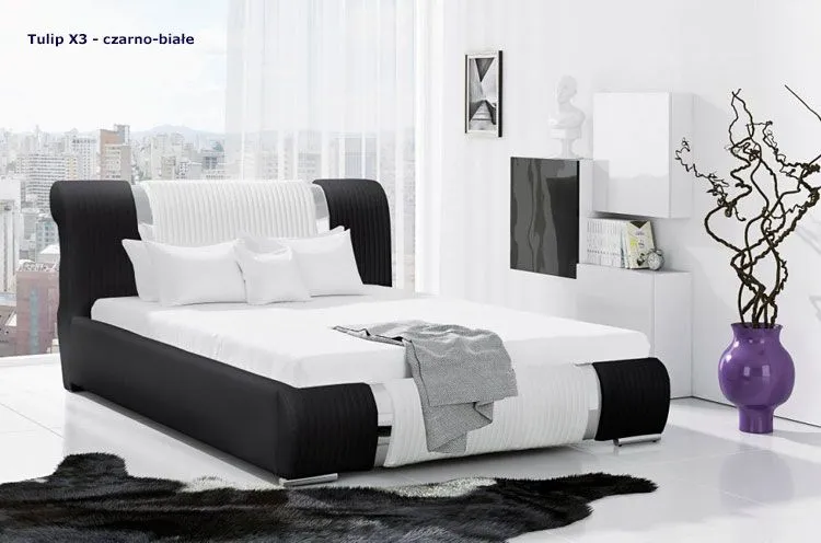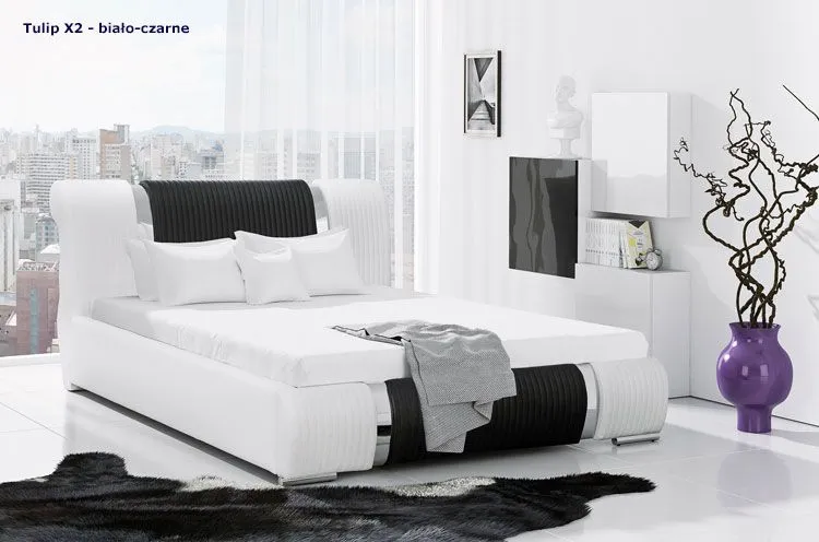 Biel i czerń to klasyczny, ponadczasowy trend w aranżacji wnętrz. Tapicerowane łóżka w kolorach czerni i bieli są szykowne i eleganckie, nadają każdej sypialni wytwornego charakteru. Tapicerowane łóżko Tulip marki Elior wyposażone zostało w wysoki pikowany zagłówek, solidną ramę i stelaż z elastycznymi listewkami drewnianymi podnoszącymi komfort spania oraz stabilne niklowane nóżki. To wyjątkowy mebel, jakiego nie znajdziesz wśród produktów konkurencji. Designerska tapicerka łóżka Tulip pokryta została w zależności od modelu: łatwą do utrzymania w czystości ekoskórą Madryt 7 TX (skórą ekologiczną) lub odporną na uszkodzenia, luksusową, niesamowicie miękką w dotyku tkaniną Aston V3. Ekoskóra używana przy produkcji mebli marki Elior jest o wiele bardziej odporna na słońce oraz substancje płynne , co pozwala Ci na długie i bezpieczne użytkowanie. Już nie musisz się martwić, że rozlana kawa czy herbata spowoduje konieczność wymiany mebla. Skóra ekologiczna Madryt 7 TX marki Elior została pokryta warstwą polichlorku winylu. Tkanina Aston V3 charakteryzuje się podwyższoną odpornością na uszkodzenia mechaniczne i chemiczne oraz łatwością w czyszczeniu. Zastosowanie dokładnie wyselekcjonowanych ultramikrowłókien o objętości aż do 24-razy drobniejszej od ludzkiego włosa, sprawia że materiał nie zmienia swojej barwy po przetarciu tkaniny ręką. Skrzynia i boki łóżka oraz zagłówek są tapicerowane tym samym materiałem, aby tworzyły jednolitą całość, dodatkowo zagłówek oraz skrzynia zostały ozdobione niklowanymi listwami o lustrzanym połysku. Tak zaprojektowane tapicerowane łóżko Paleo marki Elior prezentuje się niezwykle elegancko i wykwintnie, a przy tym jest wyjątkowo trwałe i wygodne.