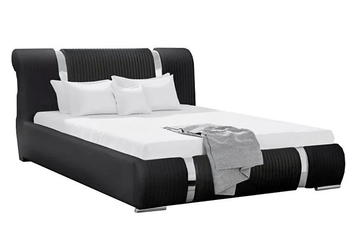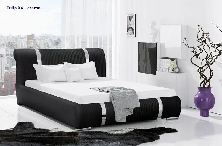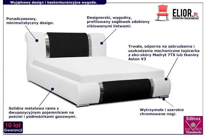 Biel i czerń to klasyczny, ponadczasowy trend w aranżacji wnętrz. Tapicerowane łóżka w kolorach czerni i bieli są szykowne i eleganckie, nadają każdej sypialni wytwornego charakteru. Tapicerowane łóżko Tulip marki Elior wyposażone zostało w wysoki pikowany zagłówek, solidną ramę i stelaż z elastycznymi listewkami drewnianymi podnoszącymi komfort spania oraz stabilne niklowane nóżki. To wyjątkowy mebel, jakiego nie znajdziesz wśród produktów konkurencji. Designerska tapicerka łóżka Tulip pokryta została w zależności od modelu: łatwą do utrzymania w czystości ekoskórą Madryt 7 TX (skórą ekologiczną) lub odporną na uszkodzenia, luksusową, niesamowicie miękką w dotyku tkaniną Aston V3. Ekoskóra używana przy produkcji mebli marki Elior jest o wiele bardziej odporna na słońce oraz substancje płynne , co pozwala Ci na długie i bezpieczne użytkowanie. Już nie musisz się martwić, że rozlana kawa czy herbata spowoduje konieczność wymiany mebla. Skóra ekologiczna Madryt 7 TX marki Elior została pokryta warstwą polichlorku winylu. Tkanina Aston V3 charakteryzuje się podwyższoną odpornością na uszkodzenia mechaniczne i chemiczne oraz łatwością w czyszczeniu. Zastosowanie dokładnie wyselekcjonowanych ultramikrowłókien o objętości aż do 24-razy drobniejszej od ludzkiego włosa, sprawia że materiał nie zmienia swojej barwy po przetarciu tkaniny ręką. Skrzynia i boki łóżka oraz zagłówek są tapicerowane tym samym materiałem, aby tworzyły jednolitą całość, dodatkowo zagłówek oraz skrzynia zostały ozdobione niklowanymi listwami o lustrzanym połysku. Tak zaprojektowane tapicerowane łóżko Paleo marki Elior prezentuje się niezwykle elegancko i wykwintnie, a przy tym jest wyjątkowo trwałe i wygodne.