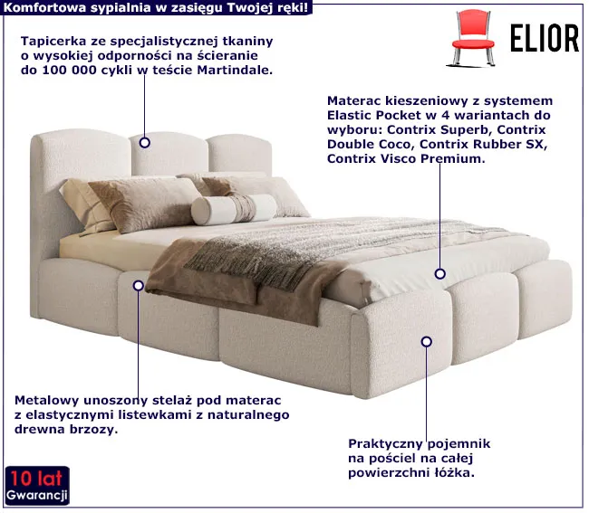 • Łóżko wyposażone jest w pojemnik na pościel, stelaż metalowy na sprężynowych podnośnikach, oraz wysokiej jakości nowoczesny materac do wyboru.