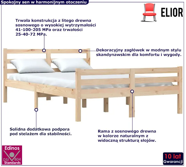 Łóżko Fenso 4X zostało wykonane z litego drewna sosnowego, które wyróżnia się wysoką sprężystością i odpornością na uszkodzenia. Solidna sosnowa konstrukcja gwarantuje stabilność i trwałość na wiele lat użytkowania ale także reguluje wilgotność powietrza, tworząc zdrowy mikroklimat w sypialni. Trwałe listwy stelaża z solidnej sklejki zapewniają dobre rozłożenie ciężaru, dzięki czemu materac pozostaje na swoim miejscu przy każdej zmianie pozycji ciała podczas snu. Wysoki, dekoracyjny zagłówek dodaje elegancji, a jednocześnie zapewnia komfort podczas wieczornego relaksu. Struktura drewna z naturalnym rysunkiem słojów nadaje meblowi przytulny, a zarazem unikalny charakter, dzięki czemu łóżko Fenso 4X idealnie wpisuje się w różnorodne style aranżacji sypialni.