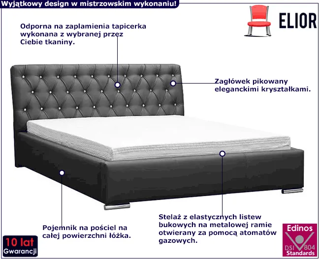 Wysokie, pikowane kryształkami wezgłowie stanowi praktyczne podparcie podczas czytania pasjonującej książki, oglądania ulubionego serialu w tv czy romantycznego śniadania w miłym towarzystwie. Umieszczony na całej powierzchni łóżka pojemnik jest skuteczną ochroną przed zakurzeniem pościeli. Pościel z łatwością wyjmiesz podnosząc stelaż na siłownikach gazowych. Luxor zapewnia Ci nie tylko chwile upragnionego wypoczynku w samotności, jak też niezapomniane chwile we dwoje z bliską Ci osobą. Daj się uwieść niesamowitemu designowi i niezrównanemu komfortowi łóżka Luxor - nie uwierzysz, jak mogłeś obejść się bez niego do tej pory!
