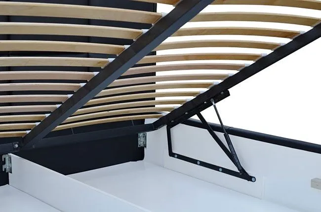 - Łóżko wyposażone jest w komfortowy pojemnik na pościel oraz drewniany stelaż na metalowej ramie z siłownikami gazowymi.