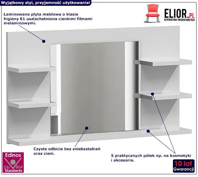 - Kolor: Biały połysk. Kliknij w link i sprawdź także inne lustra łazienkowe w sklepie Edinos.pl. Stwórz swój praktyczny zestaw mebli.
