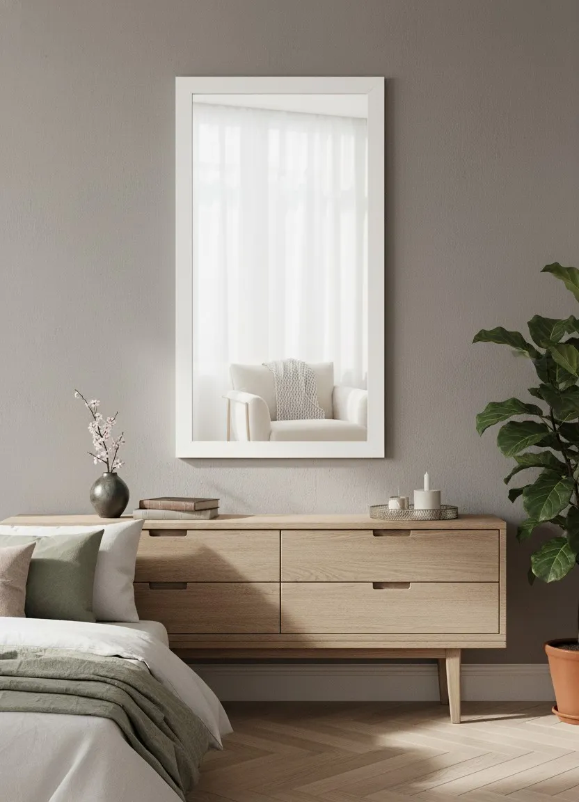 Bardzo dobrze wykonane lustro jego neutralny kolor i drewniana ramka pasują do różnych stylów wnętrz, od skandynawskiego po nowoczesny. Odbicie jest ostre i klarowne, a całość wygląda jak z droższego katalogu wnętrzarskiego.