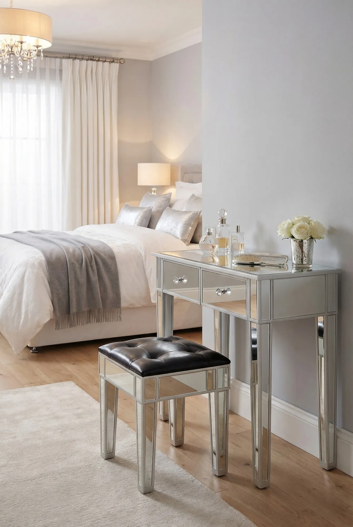 Aranżacja sypialni z toaletką z szufladami i stołkiem Helium