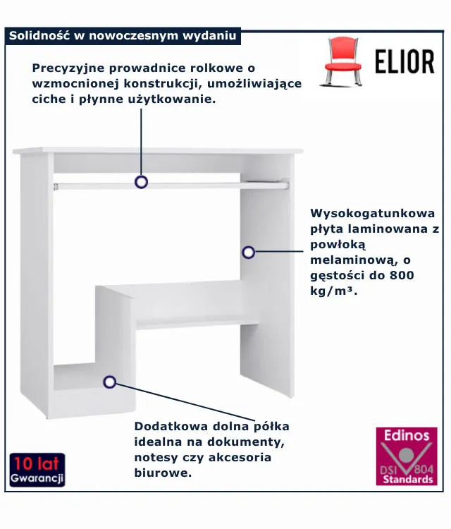 Faxo marki Edinos Premium to biurko, które pomoże Ci zorganizować codzienną pracę bez kompromisów. Doskonale sprawdzi się zarówno jako mebel do nauki w pokoju ucznia, jak i funkcjonalna stacja robocza w domowym biurze. Jeśli szukasz prostego, ale praktycznego rozwiązania, to właśnie znalazłeś idealne biurko. Zamów biurko Faxo marki Edinos Premium już dziś w cenie 238 zł i stwórz komfortowe miejsce do pracy, nawet w najmniejszym wnętrzu!