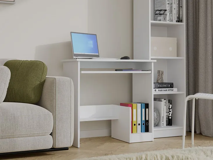 Bardzo fajne, kompaktowe biurko do pracy przy komputerze. Biała kolorystyka rozjaśnia pomieszczenie i pasuje do nowoczesnych wnętrz. Szafka boczna to świetny dodatek, bo wszystko ma swoje miejsce, extra mebel generalnie.