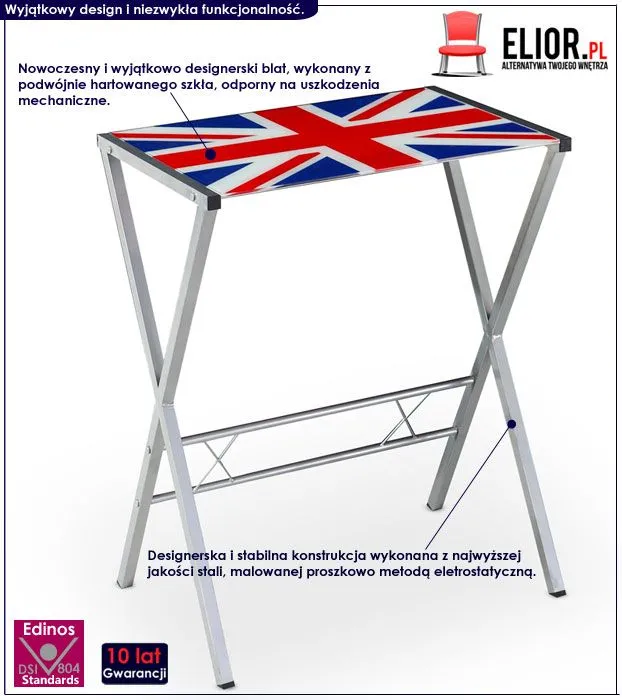 - Kolor: blat z flagą Wielkiej Brytanii, konstrukcja w kolorze srebrnym.