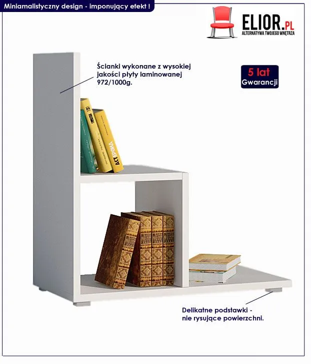 Absurdalnie supernowoczesny, designerski i komfortowy.. dlaczego? Komfortowy regał Cesaro 4R wyróżnia się nie tylko swoją praktyczną formą i ekstrawersyjnym kształtem, ale także zastosowaniem materiałów najlepszej jakości. To dlatego cieszy się powodzeniem wśród osób lubiących nowatorskie rozwiązania. Użyta do produkcji mebla naturalna płyta laminowana o objętości aż 93 dm3, została uszlachetniona i pokryta cienkimi filmami melaminowymi. Posiada także specjalne włókna ułożone różnokierunkowo, co zapewnia nadanie jej cech jakościowych oraz wytrzymałościowych. Uważaj na podobne produkty innych producentów, wykonane z importowanej, chińskiej i papierowej płyty MDF, które łamią się przy lekkim stuknięciu w korpus. Tylko jakość mebli marki Elior potwierdzona jest aż 5-cio letnią gwarancją! Odmień Swoje wnętrze już dziś i zaplanuj wymarzony "Kawałek Nieba"!