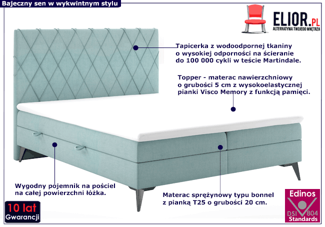 - Łóżko wyposażone jest w pojemnik na pościel, wysokiej jakości materac bazowy typu bonell z pianką T 25 o grubości 20 cm i Topper z pianki Visco Memory o grubości 5 cm.