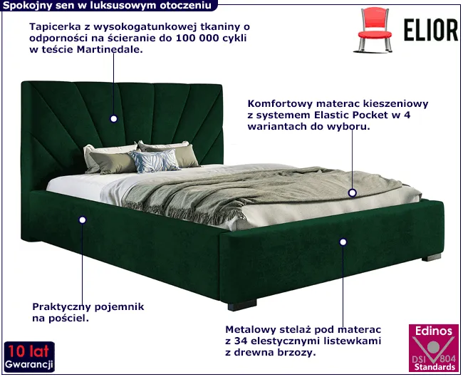 Mistrzowskie łóżko Lenar 2X marki Edinos Premium to wyjątkowy model charakteryzujący się doborem doskonałej jakości komponentów oraz wybitnym designem na najwyższym europejskim poziomie. Skrzynię łóżka oraz zagłówek pokrywa elegancka tapicerka z kolekcji francuskich welwetów marki Edinos Premium. Do wyboru masz aż 36 kolorów i 2 rodzaje tapicerek: