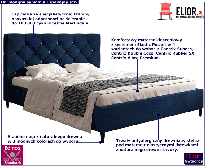 Sobral to ekskluzywny model łóżka z limitowanej kolekcji marki Edinos Premium, zaprojektowany z myślą o osobach, dla których w równym stopniu liczy się jakość, wygoda oraz wyrazisty design. Podstawę łóżka Sobral stanowi skrzynia wykonana z naturalnego drewna i płyty meblowej zbudowanej z włókien drzewnych, związków organicznych oraz dodatkowo uszlachetnionej cienkimi filmami melaminowymi w celu zwiększenia trwałości. Na skrzyni obłożonej profesjonalną pianką o grubości T25 i tapicerowanej szlachetną tkaniną welwetową opiera się doskonały jakościowo drewniany stelaż wykonany z mocnych sprężynujących listew z naturalnego drewna brzozowego. Tak skonstruowany stelaż ułatwia cyrkulację powietrza pod materacem, co doskonale wpływa na jakość snu oraz wydłuża żywotność materaca. Wysoki, pikowany zagłówek chroni ścianę przed zabrudzeniem i daje komfortowe oparcie dla kręgosłupa podczas lektury przed snem lub weekendowych śniadań w łóżku. A jego dodatkowym walorem jest fenomenalny efekt dekoracyjny, dzięki któremu zamienisz swoją sypialnię w oazę relaksu i harmonii.