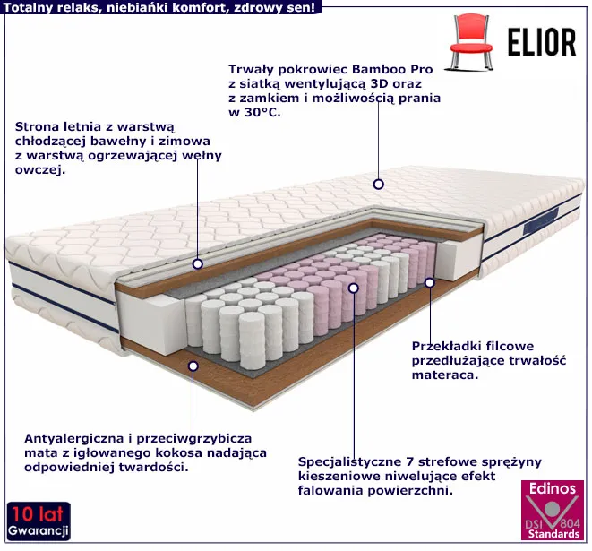 • Materiał: warstwa bawełny i wełny, mata kokosowa, sprężyny kieszniowe, przekładki filcowe, antybakteryjny pokrowiec z możliwością prania w 30?.