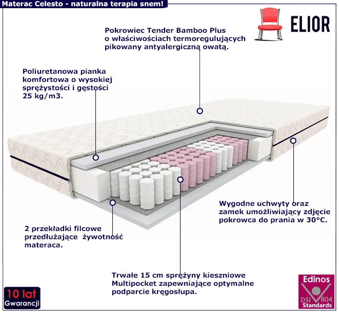 • Materiał: 2 warstwy poliuretanowej pianki o wysokości 2 cm, sprężyny kieszeniowe Multipocket, pikowany pokrowiec z możliwością prania w 30º.