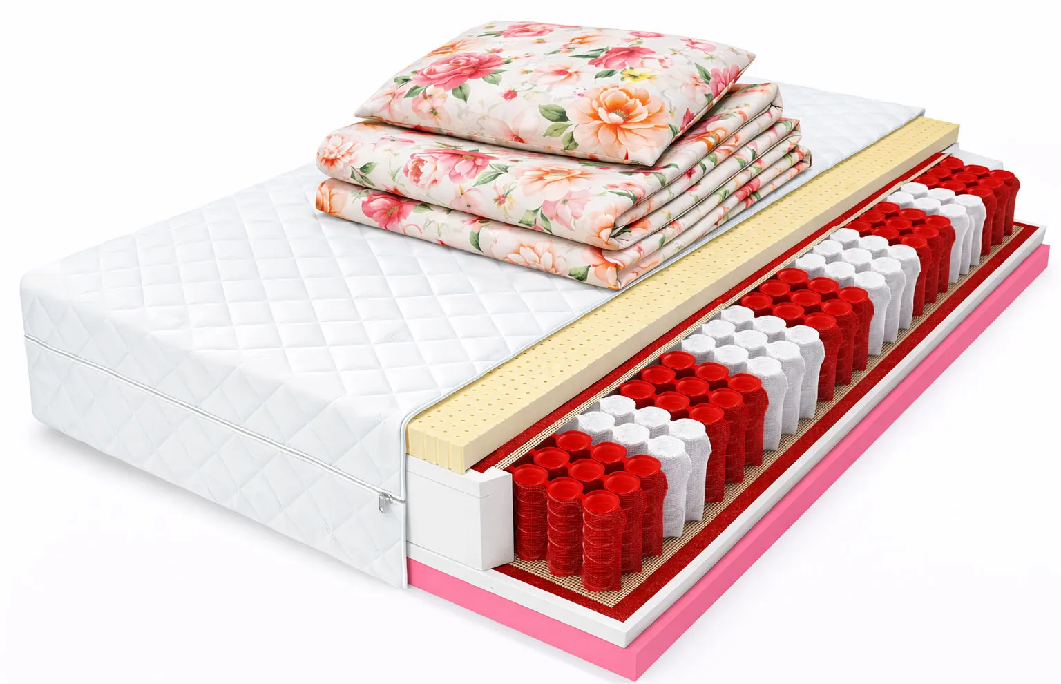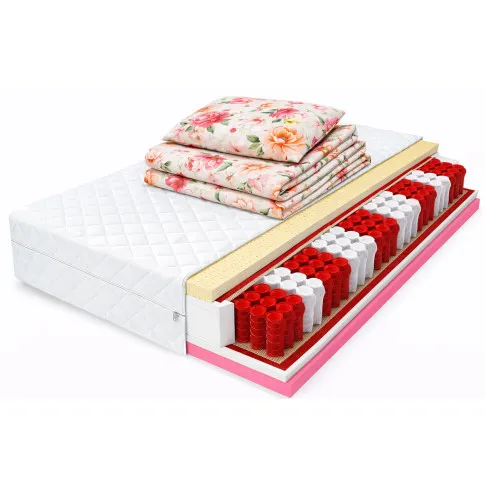 Zobrazujmy tą wyjątkowość krok, po kroku.. Najpierw świeży, przyjemny dotyk antyalergicznego pokrowca o membranowej strukturze, wykonanego z najwyższej jakości materiałów. Komfort użytkowania, to także możliwość prania pokrowca tak często, jak tylko chcesz. Jest to możliwe dzięki wszytemu zamkowi, który umożliwia łatwe ściąganie pokrowca. Pierwszą cztery-centymetrową warstwę materaca stanowi wysoko elastyczny, perforowany lateks, który fantastycznie dopasowuje się do Twojej sylwetki, zapewnia właściwą wentylację, jest surowcem odpornym na zużycie przez wiele lat. Dodatkową zaletą tej warstwy jest szerokie spektrum właściwości antyalergicznych. Idźmy dalej. Kolejną warstwę stanowi dwu-centymetrowa pianka poliuretanowa T25. To pianka o wysokiej odporności na odkształcenia i wgniecenia. Jej elastyczność i sprężystość zwiększają amortyzację sylwetki, podczas snu. Następną warstwą jest przekładka tapicerska, oddzielająca sprężyny od warstwy pianki. Jej głównym zadaniem jest wzmocnienie konstrukcji materaca i wydłużenie jego żywotności. Cztery- centymetrowa termoplastyczna pianka Visco memory jest kolejną warstwą materaca. To warstwa reagująca na temperaturę i siłę nacisku ciała. Najważniejszą właściwością pianki Visco memory jest zapobieganie powstawaniu odleżyn, niwelowanie bólu kręgosłupa, oraz poprawianie krążenia krwi. Warstwa pianki przepuszcza i odprowadza wilgoć, co bezpośrednio wpływa na komfort spania. Ostatnią warstwę stanowią dwunasto-centymetrowe strefowe sprężyny multipocketowe. Dzięki strefom o zróżnicowanej twardości zapewniają one ergonomiczną pozycję ciała podczas snu. Jeśli dzielisz łóżko ze swoją drugą połową, z pewnością tzw. wiercenie się i obracanie podczas snu nie będzie stanowiło problemu dla żadnego z was.