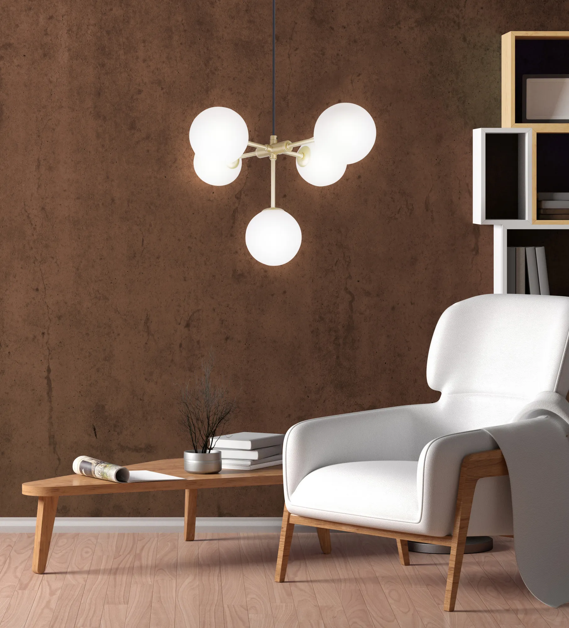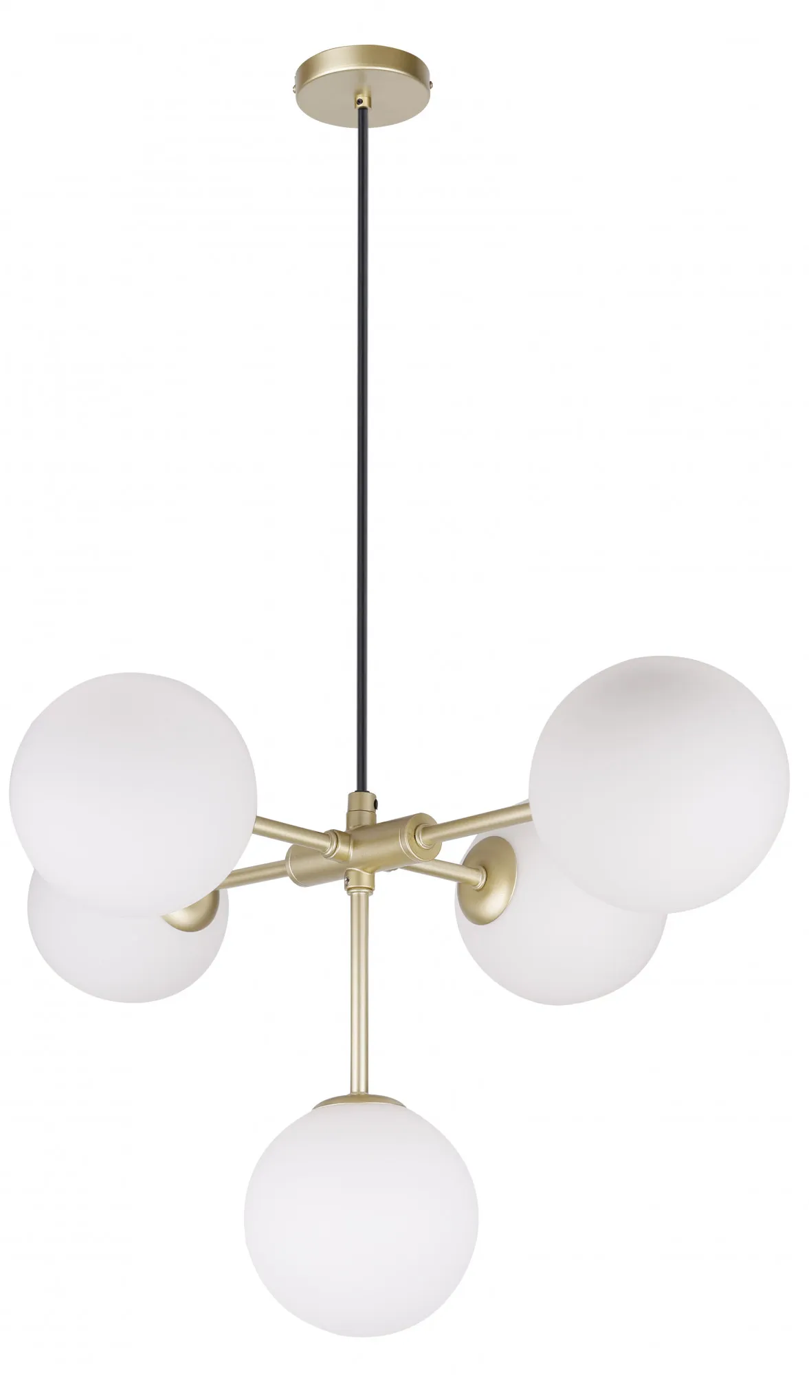 Nowoczesny zwis z klasycznym charakterem. Wykonany z metalu, wykończony w efekcie mosiądzu. Pięć mlecznych kloszy nadają subtelnego wyrazu dla każdego wnętrza. Idealnie komponuje się we wnętrzach salonu, jadalni jak i wnętrzach biurowych.