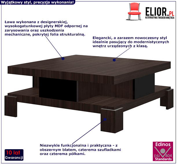 - Produkt posiada certyfikat jakości "Edinos Standards DSI 804", który potwierdza najwyższą jakość wykonania mebla oraz pełny stopień zgodności poszczególnych jednostek wytworzonego wyrobu z przyjętym wzorcem.