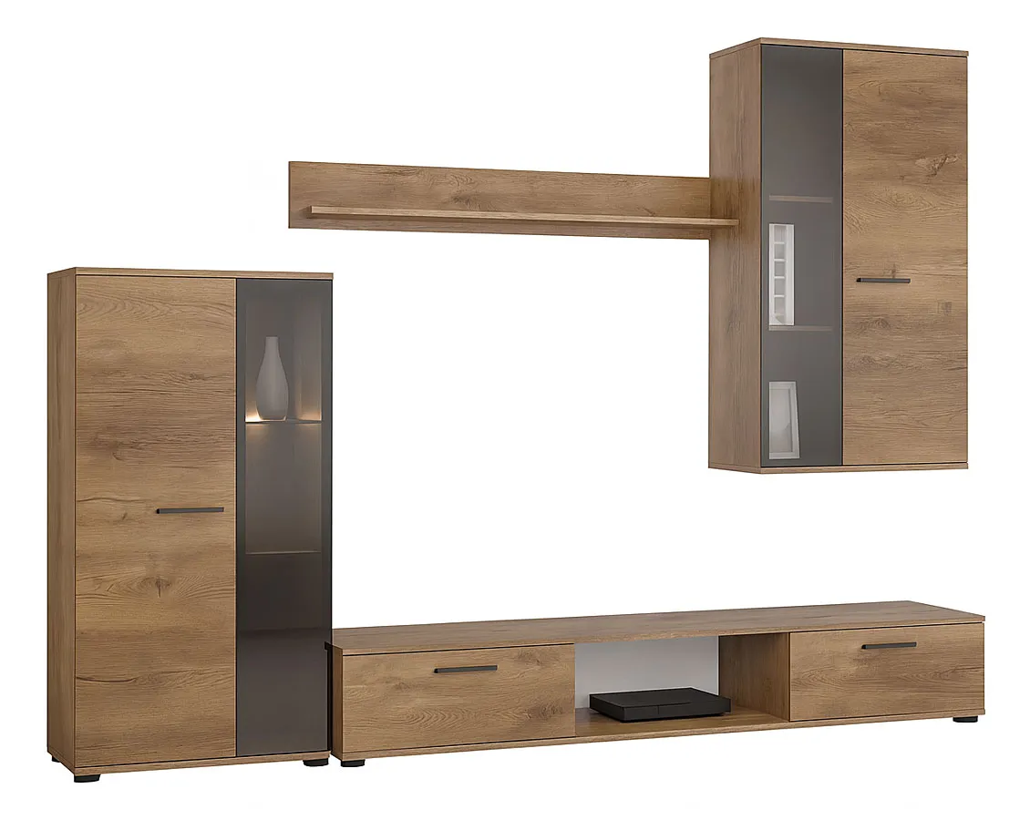 • Komplet modułów: niska szafka RTV z otwartymi wnękami, witryna stojąca, witryna wisząca oraz półka na dekoracje.