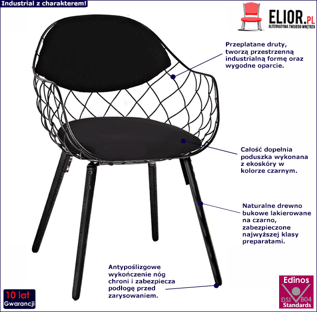 Konstrukcja mebla wykonana została z najwyższej jakości metalu pomalowanego proszkowo odpornym na zarysowania i zadrapania. Najwyższa jakość techniki metody natrysku proszkowego pozwoliła zaoferować marce Edinos Premium aż 10 lat gwarancji na swoje produkty. Technika malowania proszkowego charakteryzuje się dużą trwałością, odpornością na korozję, chemikalia, wysoką temperaturę oraz uszkodzenia mechaniczne, dzięki czemu znacznie podnosi walory użytkowe i estetyczne mebla. Wygodne i praktyczne siedzisko to zasługa designerskiej tapicerki w kolorze czarnym pokrytej najwyższej jakości skórą ekologiczną, łatwą do utrzymania w czystości, co jest szczególnie istotne w przypadku produktów wykorzystywanych podczas spożywania posiłków. Ekoskóra używana przy produkcji mebli marki Edinos Premium jest o wiele bardziej odporna na słońce oraz substancje płynne , co pozwala Ci na długie i bezpieczne użytkowanie. Plama po hucznej imprezie nie będzie już dla Ciebie problemem!