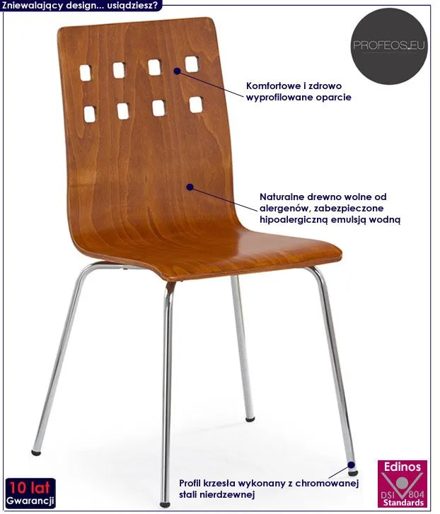 Oryginalne i komfortowe krzesło Millis wyróżnia się nie tylko swoją unikalną formą, ale także zastosowaniem materiałów najlepszej jakości. Siedzisko oraz oparcie mebla w kolorze czereśnia antyczna wyprodukowane zostały z naturalnego drewna wolnego od alergenów, a następnie zabezpieczonego hipoalergiczną emulsją wodną. Profil krzesła stworzony jest z najwyższej jakości chromowanej stali o zawartości aż stali nierdzewnej oraz chromu, co gwarantuje mu niezwykły efekt wizualny, posiadając przy tym ponadprzeciętne cechy antykorozyjne oraz lepszą odporność na uszkodzenia mechaniczne . Krzesło Millis zapewnia Ci niezapomniane chwile przy stole w gronie przyjaciół i rodziny. Pozwól by odmieniło również Twoje wnętrze!