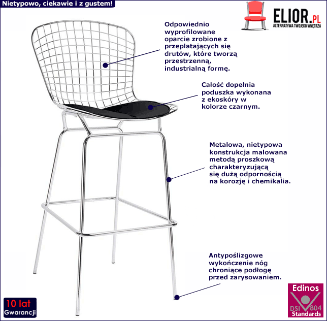 Konstrukcja mebla wykonana została z najwyższej jakości metalu/stali nierdzewnej pomalowanej proszkowo odpornym na zarysowania i zadrapania. Najwyższa jakość techniki metody natrysku proszkowego pozwoliła zaoferować firmie Elior aż 10 lat gwar. na swoje produkty. Technika malowania proszkowego charakteryzuje się dużą trwałością, odpornością na korozję, chemikalia, wysoką temperaturę oraz uszkodzenia mechaniczne, dzięki czemu znacznie podnosi walory użytkowe i estetyczne mebla. Designerska tapicerka została wykonana z najwyższej jakości skóry ekologicznej, łatwej do utrzymania w czystości (co jest szczególnie istotne w przypadku produktów wykorzystywanych podczas spożywania posiłków). Ekoskóra używana przy produkcji mebli marki Elior jest o wiele bardziej odporna na słońce oraz substancje płynne , co pozwala Ci na długie i bezpieczne użytkowanie. Plama po porannej kawie lub przyjęciu z czerwonym winem nie spowoduje już więcej konieczności wymiany tapicerki. Ponadto metalowe nogi hokera zostały udoskonalone w antypoślizgowe wykończenie, w trosce o bezpieczeństwo Twoje i Twoich podłóg! Bez obaw możesz korzystać z mebla w dowolnej pozycji, wykończenia te zapewnią Ci stabilność i równowagę, a także ochronę przed zarysowaniami i uszkodzeniami mechanicznymi powierzchni Twojego domu.