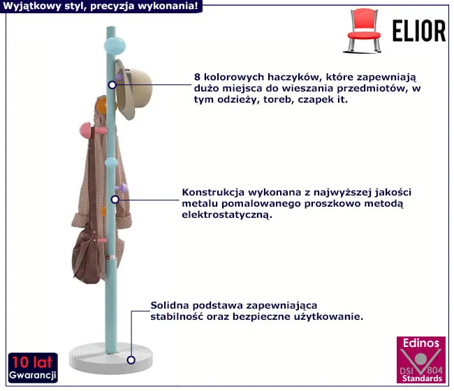 Lekka, a jednocześnie stabilna konstrukcja. Sprawdza się zarówno w korytarzu, jak i pokoju dziecięcym. Osiem haczyków to wystarczająco, by uporządkować codzienne ubrania. Kolorystycznie wpisuje się w nowoczesne wnętrza. Montaż zajął kilka minut i nie wymagał dodatkowych narzędzi.