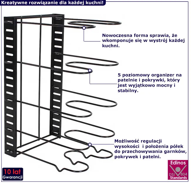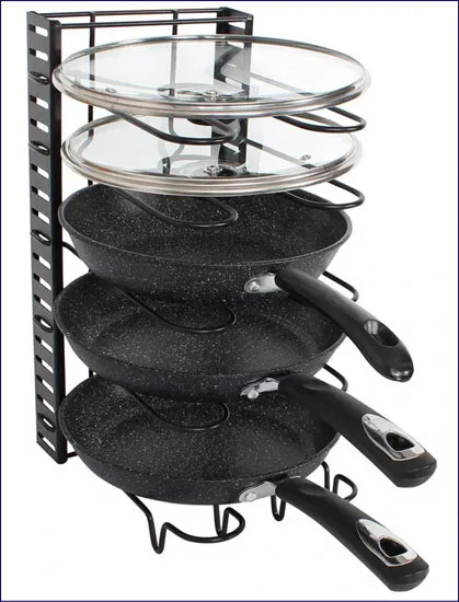 • 5 poziomowy organizer na patelnie i pokrywki.