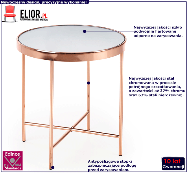 - Kolor: Blat mebla z efektem lustra, konstrukcja w kolorze miedzi. Kliknij w link i sprawdź także inne okrągłe ławy w sklepie Edinos.pl. Stwórz swój praktyczny zestaw mebli.