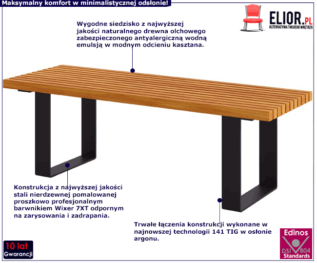 Jakie cechy powinna mieć ławka parkowa? Powinna być stylowa, by romantyczne randki miały właściwą oprawę. Musi być bezpieczna i zapewniać komfortowe miejsce odpoczynku dla najmłodszych miłośników zabawy w parku. I w końcu, powinna być trwała, by służyć spacerowiczom przez wiele sezonów. I taką właśnie ławkę parkowo-ogrodową z przyjemnością i dumą prezentujemy. Oto doskonała ławka miejska Austis 3X 180 cm marki Edinos Premium - przedstawiciel małej architektury ogrodowej o uniwersalnych możliwościach aranżacyjnych. Minimalistyczny design i oryginalna kolorystyka doskonale odnajdują się w przestrzeni każdego, nawet niewielkiego ogrodu. Ławka Austis 3X doskonale uzupełni krajobraz rekreacyjnych przestrzeni miejskich: parków, skwerów, ogródków jordanowskich, placów i pasaży spacerowych. Ten model ławki zrobiliśmy z naturalnego drewna olchowego w modnym wybarwieniu kasztanowym. Dokładnie szlifowaną powierzchnię materiału zabezpieczyliśmy naturalnym impregnatem ochronnym na bazie oleju, który chroni przed zarysowaniem oraz przetarciem drewna. Emulsje ochronne marki Edinos Premium są całkowicie wolne od formaldehydu, dzięki czemu charakteryzują się neutralnym zapachem. Nie zawierają substancji, które w trakcie użytkowania mebli mogą się ulatniać, ani innych szkodliwych związków chemicznych. Stabilna podstawa ze stalowych profili w eleganckiej czarnej odsłonie nadaje ławce wyjątkowego uroku w modnym minimalistycznym stylu i wspaniale komponuje się z parkową i ogrodową architekturą. Postaw na najwyższą jakość, zainwestuj w ten doskonały mebel ogrodowy polecany przez specjalistów od aranżacji przestrzeni miejskiej. Poczuj rytm swojego miasta i odkryj pełnię możliwości z ławką Austis 3X marki Edinos Premium!