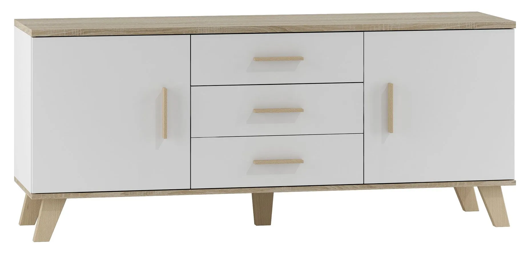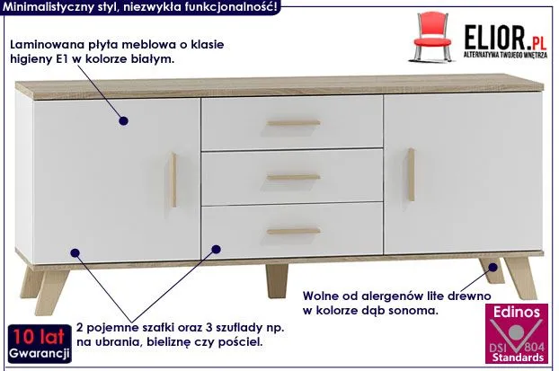 Designerska komoda Bodi 3X wyróżnia się nie tylko swoją praktyczną formą i eleganckim kształtem, ale także zastosowaniem materiałów najlepszej jakości. To dlatego cieszy się powodzeniem wśród osób lubiących nowatorskie rozwiązania. Użyta do produkcji szafki laminowana płyta meblowa w kolorze biały mat została uszlachetniona cienkimi filmami melaminowymi. Posiada także specjalne włókna ułożone różnokierunkowo o strukturze sinusoidalnej, co zapewnia nadanie jej cech jakościowych oraz wytrzymałościowych. Nóżki komody wyprodukowano z wolnego od alergenów naturalnego drewna bukowego, odznaczającego się ponadprzeciętną trwałością i niepodatnością na uszkodzenia mechaniczne. Prowadnice szuflad z funkcją cichego domyku "HAFRIS 7XZ" gwarantują Ci niezwykle funkcjonalne korzystanie z mebla. Dwie przestronne szafki oraz trzy pojemne szuflady są wyjątkowo praktyczne i zapewniają komfortowe przechowywanie np. odzieży czy pościeli. Stonowana kolorystyka i prosta forma sprawiają, że komoda Bodi 3X doskonale sprawdza się we wnętrzach urządzonych w stylu skandynawskim, minimalistycznym czy nowoczesnym. Stwórz w swoim domu niepowtarzalny i ciepły klimat z szafką marki Elior!