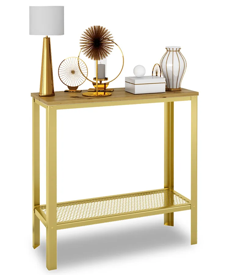 Minimalistyczna konsola z półką złoty + dąb artisan - Erid 3X