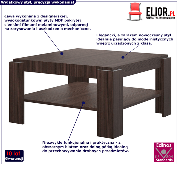 - Produkt posiada certyfikat jakości "Edinos Standards DSI 804", który potwierdza najwyższą jakość wykonania mebla oraz pełny stopień zgodności poszczególnych jednostek wytworzonego wyrobu z przyjętym wzorcem.
