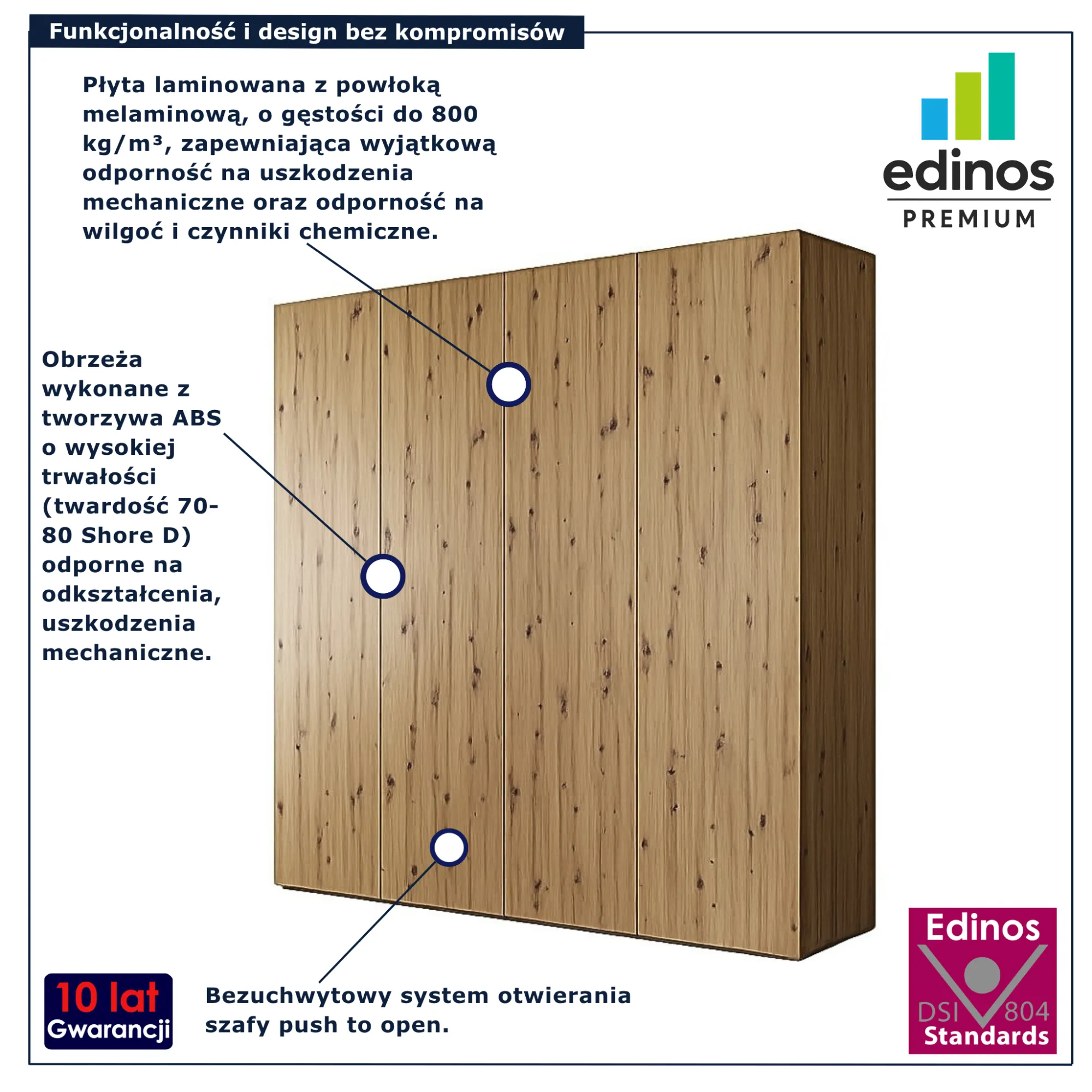 • Produkt posiada certyfikat jakości "Edinos Standards DSI 804", który potwierdza najwyższą jakość wykonania mebla oraz pełny stopień zgodności poszczególnych jednostek wytworzonego wyrobu z przyjętym wzorcem.