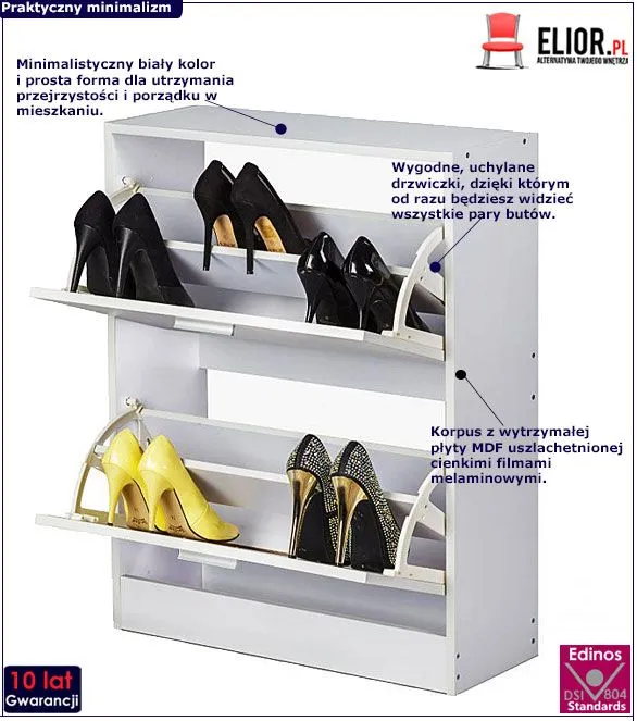 Zapoznaj się z technologią Elior, w której wszystkie meble są dobrze dopracowane w wykonaniu ale i bezpieczne: w przeciwieństwie do konkurencyjnych produktów, nie zawiera ona chloru, metali ciężkich ani związków ropopochodnych, dzięki czemu nie przebarwia się, a meble łatwo jest utrzymać w czystości. Uważamy, że w dzisiejszych czasach dbałość o te aspekty jest oczywistością i standardem, którego trzeba dotrzymać. W utrzymaniu czystości oraz długiej użyteczności szafki pomagają bez wątpienia porządne uchwyty z aluminium o strukturze szczotkowanej, która gwarantuje wygodniejszy chwyt i stabilny montaż całej konstrukcji. Jak widzisz, szafka na buty Tivi 2X marki Elior to najlepszy kandydat w kategorii, który sprawdzi się doskonale w przedpokoju czy w garderobie, dodatkowo dodając stylu i estetyki minimalistycznym czy każdym innym współczesnym wnętrzom.