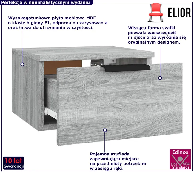Szafka nocna Tracy marki Edinos Premium to kwintesencja elegancji i praktyczności, idealnie komponująca się z nowoczesnym wnętrzem. Ta wisząca szafka nocna, łącząca w sobie funkcjonalność z subtelnym designem, to idealny dodatek do każdej sypialni. Dzięki niej wszystkie najpotrzebniejsze przedmioty znajdą się w zasięgu Twojej ręki, a Ty zyskasz komfort i styl o jakim nawet nie śnisz!