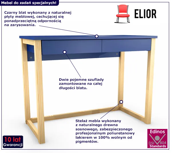 Użyta do budowy biurka Mioxis 3X marki Elior naturalna płyta meblowa została uszlachetniona cienkimi filmami melaminowymi. Posiada także specjalne włókna ułożone różnokierunkowo, co zapewnia nadanie jej cech jakościowych oraz wytrzymałościowych. Konstrukcja mebla wykonana została w całości z naturalnego drewna sosnowego gwarantując pełną stabilność biurka oraz niezwykły, dodający radości i spokoju design dla Twojego wnętrza. Użyta do konstrukcji mebla naturalna sosna, zabezpieczona została profesjonalnym poliuretanowym lakierem w 100% wolnym od pigmentów i szkodliwych wypełniaczy zachowując przy tym naturalną fakturę oraz słoje drewna.