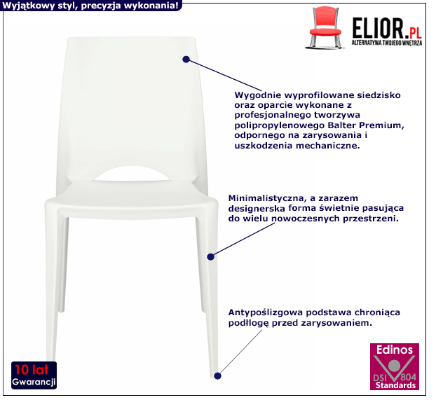 Komfortowo wykonane krzesło minimalistyczne Galis to mebel cechujący się modną, pełną wdzięku formą. Jest to zasługa między innymi starannie dobranych i niezwykle trwałych materiałów meblarskich. Dzięki nim fantastyczne krzesło praktyczne Galis użytkuje się naprawdę wygodnie, przyjemnie i co istotne – bez uszkodzeń przez wiele lat. Do produkcji niezawodnego w wielu nowoczesnych wnętrzach krzesła Galis wykorzystano poddany specjalistycznej obróbce surowiec. Jest to profesjonalne tworzywo polipropylenowe Balter Premium o podwyższonej wytrzymałości na nacisk od 70 do 100 MPa, odporne na zarysowania oraz na uszkodzenia mechaniczne. Jakże to istotne, by meble, w które inwestujemy, cechowało wytrzymałe, staranne wykonanie! Na szczęście z pomysłowym krzesłem Galis nie trzeba się o to martwić! Ten pełen nowoczesnego, a przy tym interesującego charakteru mebel wciąż cieszy oko niebywałym wdziękiem. Komfortowe krzesło designerskie Galis posiada bezsprzecznie wiele zalet – trwałość, stabilność, dokładne wykonanie, funkcjonalizm i oczywiście świeżą, pełną klasy i pomysłowości prezencję. Chyba każdy przyzna, że warto mieć tak ekstrawagancki i funkcjonalny mebel w swoich starannie i przemyślanie zaaranżowanych przestrzeniach.