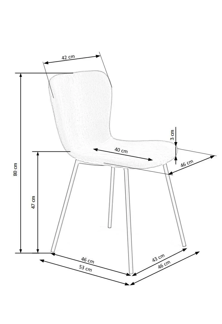Wymiary: szerokość mebla: 46 cm, szerokość siedziska: 46 cm, głębokość mebla: 53 cm, głębokość siedziska: 40 cm, wysokość całkowita: 80 cm, wysokość siedziska: 47 cm.