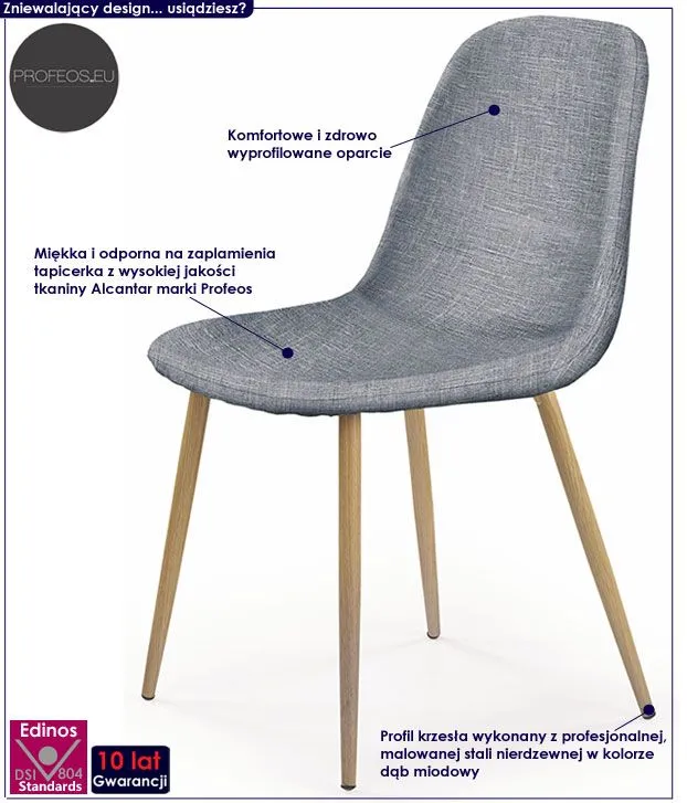 Oryginalne i komfortowe krzesło Merkena wyróżnia się nie tylko swoją unikalną formą, ale także zastosowaniem materiałów najlepszej jakości. Designerska tapicerka w kolorze popielatym wykonana została z wysokiej jakości tkaniny Alcantar Pro, charakteryzującej się dużą odpornością na ścieranie i zabrudzenie oraz niezwykłą miękkością w dotyku (dzięki warstwie poliuretanu). Tkanina Alcantar Pro marki Profeos, która jako jedyna na rynku produkowana jest z dokładnie wyselekcjonowanych ultramikrowłókien o objętości aż do 24-razy drobniejszej od ludzkiego włosa, charakteryzuje się wyjątkową żywotnością, odpornością oraz niezwykłą łatwością w utrzymaniu. Posiada ponadprzeciętne cechy wytrzymałościowe, dzięki czemu unikniesz co sezonowej wymiany tapicerki. Tkanina Alcantar jest także bardzo praktyczna i można ją czyścić na mokro, co jest niezwykle istotne w przypadku mebli wykorzystywanych podczas posiłków. Profil krzesła w kolorze dąb miodowy stworzony jest z najwyższej jakości nierdzewnej stali malowanej odpornym na zarysowania i zadrapania. Najwyższa jakość techniki polimeryzacji pozwoliła zaoferować firmie Profeos aż 10 lat gwarancji na swoje produkty. Już nie musisz się martwić, że po kilku latach część farby odpryśnie od mebla . Mebel dostępny jest w trzech modnych i uniwersalnych wersjach kolorystycznych: popielatej, kremowej oraz wielobarwnej, dzięki czemu bez problemu wybierzesz to, które najlepiej scharakteryzuje Twoje wnętrze. Krzesło Merkena zapewnia Ci niezapomniane chwile przy stole w gronie przyjaciół i rodziny. Wnieś do swojego wnętrza nastrojowy klimat, harmonizując go z ciepłem naturalnych barw!