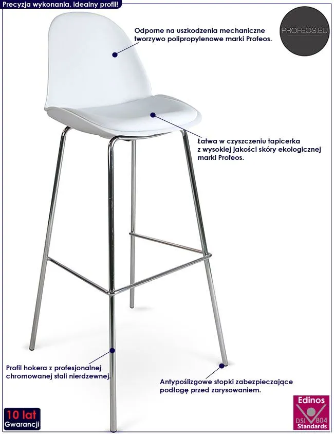 Efektowny i komfortowy hoker Balo wyróżnia się nie tylko swoją unikalną formą, ale także zastosowaniem materiałów najlepszej jakości. Designerskie białe siedzisko oraz oparcie mebla wykonane jest z profesjonalnego tworzywa polipropylenowego marki Profeos, co gwarantuje Ci wysoki komfort użytkowania. Materiał ten charakteryzuje się ponadprzeciętną wytrzymałością mechaniczną, jest również łatwy do utrzymania w czystości i można go przecierać na mokro (co jest szczególnie ważne w przypadku mebli używanych podczas posiłków). Designerska tapicerka mebla w kolorze białym pokryta została najwyższej jakości ekoskórą (skórą ekologiczną), łatwą do utrzymania w czystości. Ekoskóra używana przy produkcji mebli marki Profeos jest o wiele bardziej odporna na słońce oraz substancje płynne , co pozwala Ci na długie i bezpieczne użytkowanie. Już nie musisz się martwić, że rozlana kawa spowoduje konieczność wymiany mebla. Skóra ekologiczna marki Profeos została pokryta warstwą polichlorku winylu. Profil krzesła stworzony jest z najwyższej jakości chromowanej stali o zawartości aż stali nierdzewnej oraz chromu, co gwarantuje mu niezwykły efekt wizualny, posiadając przy tym ponadprzeciętne cechy antykorozyjne oraz lepszą odporność na uszkodzenia mechaniczne . Stonowana kolorystyka sprawia, że nowy taboret Balo świetnie sprawdza się w pomieszczeniach mieszkalnych i komercyjnych urządzonych w stylu minimalistycznym, jak też nowoczesnym i skandynawskim. Pozwól mu odmienić także Twoje wnętrze!