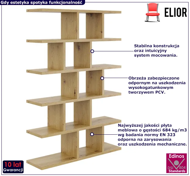Przedstawiamy Ci półkę ścienną Adelo marki Elior w stylu skandynawskim, która nie tylko zachwyci Cię swoim minimalistycznym designem, ale także dostarczy praktyczne i funkcjonalne rozwiązanie do organizacji Twojej przestrzeni. Ta wszechstronna półka posiada aż 15 przegród, które pomieszczą wszystkie Twoje ulubione przedmioty, a dzięki możliwości zawieszenia lub postawienia, możesz dostosować ją do swoich potrzeb. Doskonale odnajdzie się ona zarówno w salonie eksponując ulubione pamiątki z wakacji lub rodzinne fotografie, jak i w sypialni służąc jako biblioteczka, pokoju młodzieżowym zapewniając idealne miejsce na wszystkie zabawki, a nawet kuchni zapewniając w zasięgu ręki ulubione zioła. Pamiętaj - wszystko zależy od Twojej wyobraźni!