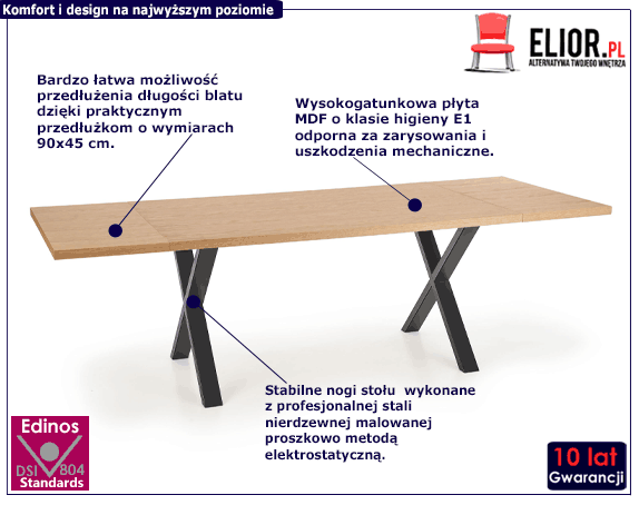 Wytrzymałość i solidne wykonanie to dla marki Elior priorytet przy tworzeniu mebli. Nie inaczej jest i w tym przypadku. Stół Karix 3X to połączenie surowców najwyższej jakości nadających mu cech wytrzymałościowych. Dzięki temu staje się odporny na przeróżne uszkodzenia. Jednocześnie zestawienie tak różnych surowców ma na celu nadać mu nowoczesnego, unikatowego designu. Blat stołu wykonany jest z profesjonalnej płyty MDF. To naturalna płyta meblowa zbudowana z włókien drzewnych i związków organicznych w warunkach wysokiego ciśnienia i temperatury. Włókna ułożone są różnokierunkowo, o strukturze sinusoidalnej, co zapewnia nadanie jej cech jakościowych oraz wytrzymałościowych. Dodatkowo płyta została uszlachetniona cienkimi filmami melaminowymi w celu zwiększenia jej trwałości. Designerskie, mocne i stabilne nogi stołu wykonane są zaś z profesjonalnej, najwyższej jakości stali nierdzewnej pomalowanej proszkowo . Dzięki temu jest niesamowicie odporny na zarysowania i zadrapania. Najwyższa jakość metody natrysku proszkowego pozwoliła zaoferować firmie Elior aż 10 lat gwar. na swoje produkty. Technika malowania proszkowego charakteryzuje się dużą trwałością, odpornością na korozje, chemikalia, wysoką temperaturę oraz uszkodzenia mechaniczne, dzięki czemu znacznie podnosi walory użytkowe i estetyczne mebla. Wszystkie zabiegi wykonane zostały po to, aby dać Ci najlepszy stół pod każdym względem, który posłuży Ci na bardzo długie lata. Urzekający blat w kolorze dębu i stalowe czarne nogi tworzą perfekcyjne połączenie, nadające mu cech wytrzymałościowych i wizualnych. Postaw zatem na jakość, funkcjonalność i styl, wybierając niezwykły stół Karix 3X.